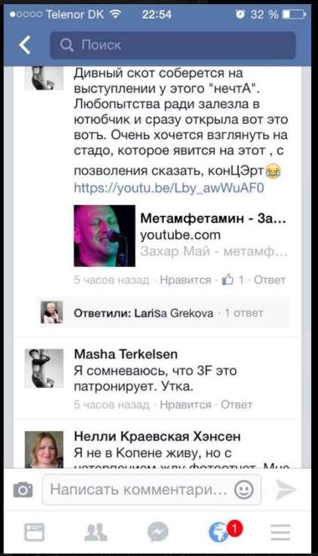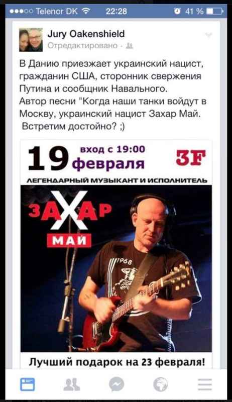Situacija daugmaž tokia: vaikinukas iš Ukrainos, dirbantis gerą darbą Daniškoje TV2 televizijoje, nusprendė atsivežti savo mėgiamą atlikėją Zaxarą May’ų, kad jis Kopenhagoje atliktų gyvo garso koncertą ukrainiečių publikai (koncertas vyks šiandien). Projektas ne pelno siekiantis, nes čia ir tų ukrainiečių tiek, kad ir 100 žmonių į renginį sunkiai susirenka, tad būtų gerai, kad bent už lėktuvo bilietą iš Amerikos iš savo kišenės mokėti nereikėtų, o jeigu bus pasiektas kažkoks pelnas, jis bus paaukotas Ukrainos labui. Viskas kaip ir būtų puiku: vieta yra, laikas yra, publikai pranešta, visi patenkinti, nes turės ką veikti penktadienio vakarą. Tačiau apie tai išgirdo rusu troliai mumiai, kurie labai Putiną palaiko ir šiaip Europos nemėgsta. Ir tada jau užvirė aistros Danijos rusų grupėse soc.mediojoje. Genialių komentarų tose grupėse gausybė, bet dėl laiko stokos pateiksiu tik kelis „geresnius” (kas su rusu kalba nedraugauja, vertimas po nuotraukomis):