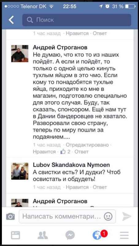 - Vertimas: „Nemanau, kad kažkas iš mūsų ten eis. O jeigu ir eis, tai tik su vienu tikslu – apmėtyti sugedusiai kiaušiniais šita „Čmo”. Jeigu kažkam tai prireiks sugedusių kiaušinių, ateikite pas mane i parduotuvę, paruošiu specialiai šitam tikslui. Dar mums čia Danijoje Banderovcų betrūko. Išvogė savo šalį, dabar per pasaulį išėjo labdaros susirinkti.